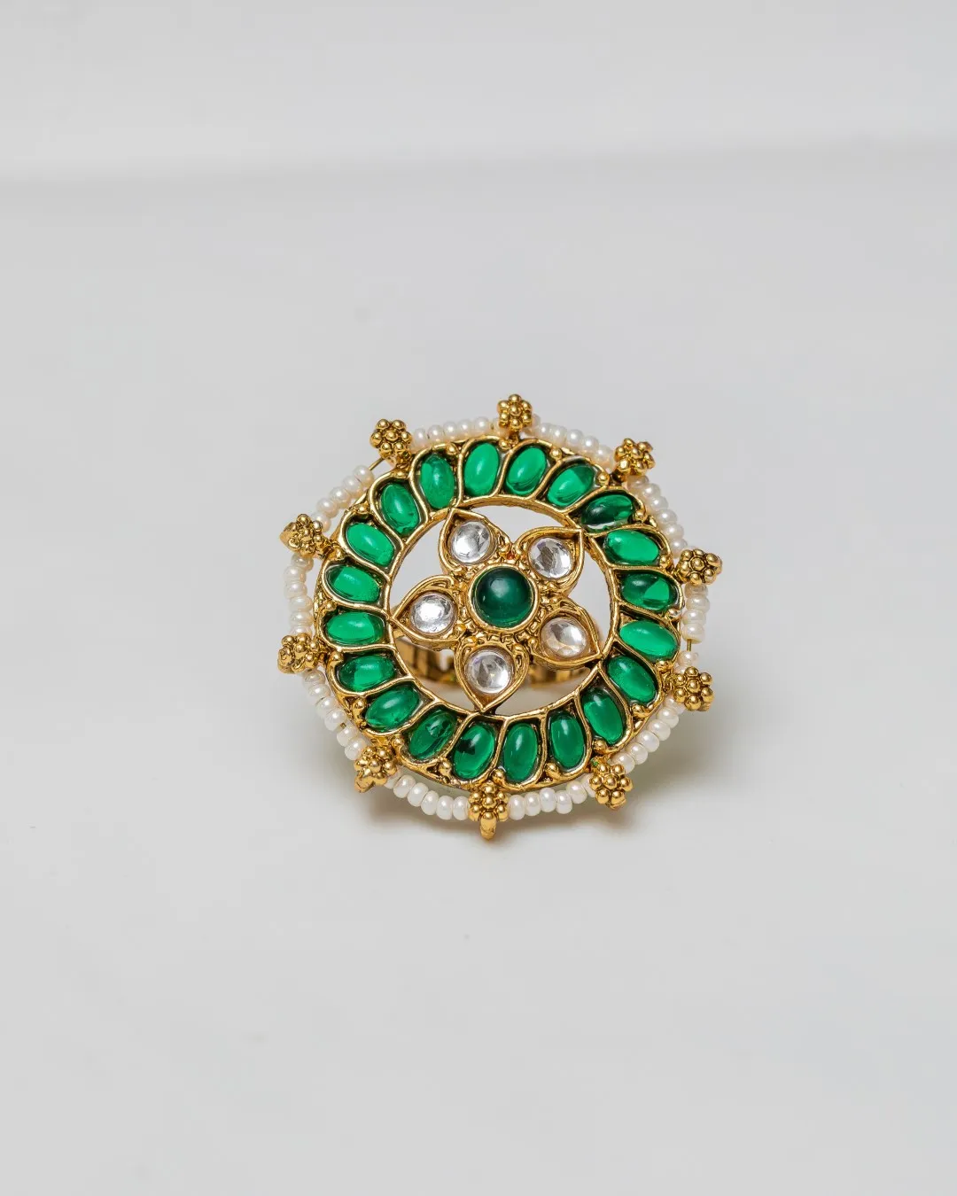 The circular silhouette of the ring becomes a canvas for the kundan-studded flower in the centre which is surrounded by rich green kemp stones, forming a captivating pattern that exudes sophistication and charm. These stones, with their vibrant hue, add a touch of royal splendor to the ring, making it a perfect accessory for grand celebrations and festive occasions.