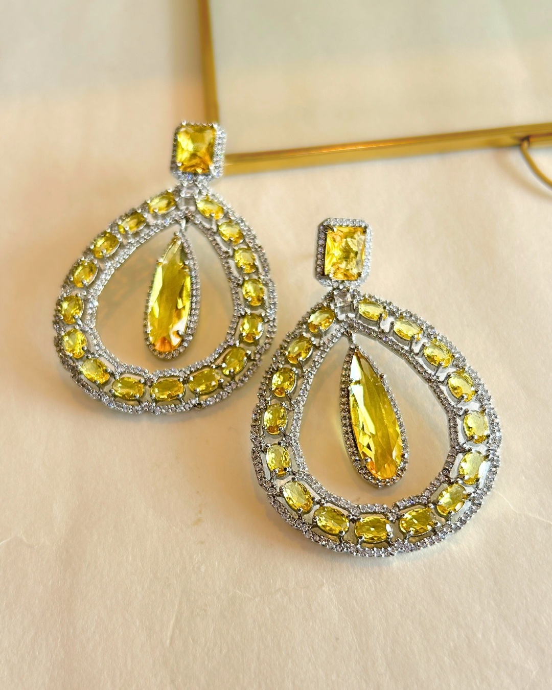 Radiating warm brilliance, these elegant Deepika earrings feature a luminous citrine teardrop suspended within a halo of sparkling stones and oval yellow gems. The graceful silhouette blends classic glamour with contemporary finesse, making them perfect for both evening occasions and celebratory gatherings. Their radiant golden hue adds a touch of sunshine to any ensemble while maintaining a refined, polished look.
