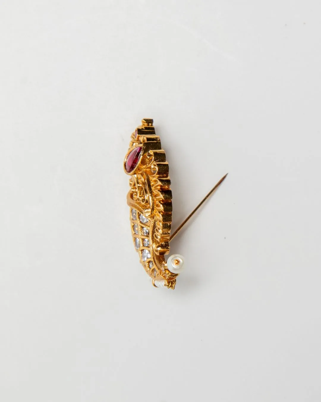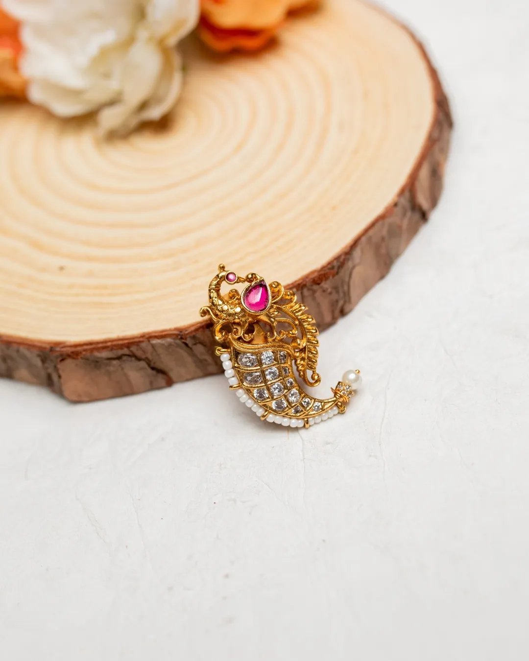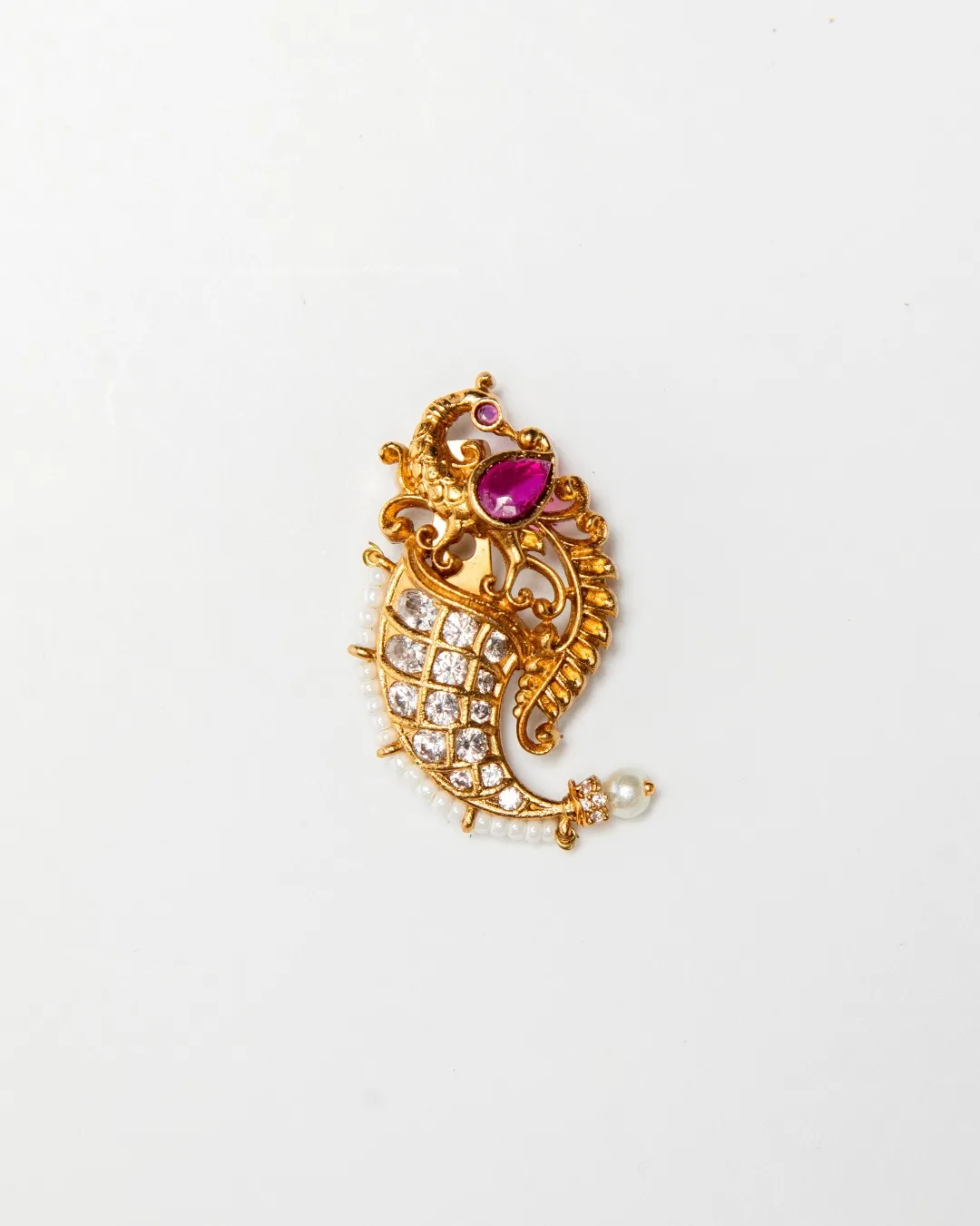 Kalki is our traditional Indian saree pin, which can also double as a brooch, features an intricately designed peacock motif. The pin is adorned with a mix of sparkling American Diamond stones, including a vibrant magenta kemp stone that serves as the eye-catching centerpiece. Delicate pearls accentuate the lower curve of the peacock’s tail, adding elegance and versatility. Ideal for enhancing sarees, shawls, or even dresses, this pin combines classic Indian artistry with modern functionality.