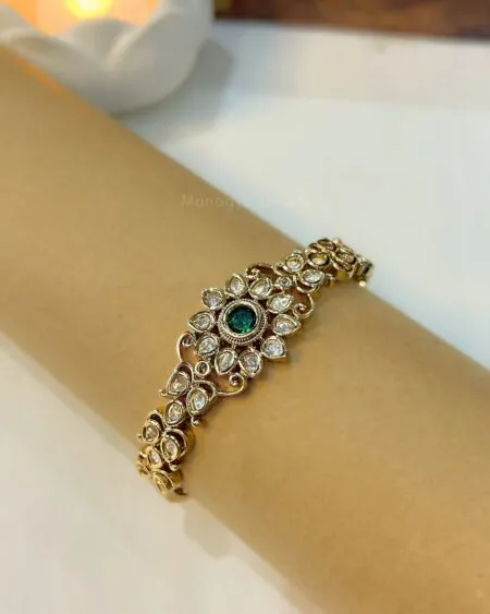 Our exquisite Venkateshwara Polki Balaji Necklace is one of those special pieces which could be valued only by true jewellery connoisseurs. The pendant with intricately carved figurine of Lord Balaji and Laxmi mata is undoubtedly the centre of attraction. The figurines are accentuated by polki kundans and diamonds. Lovely crystal and pearl droplets add to the charm of polki-studded jhumki motifs that are added to the pendant, making the entire pendant a work of art and true epitome of opulence. The necklace pendant is held together with strands of tiny pearls, and deep maroon and green crystals. The necklace is accompanied by polki jhumkas. The pendant and jhumkas feature a gorgeous victorian gold finish that subtly suggests grandeur.